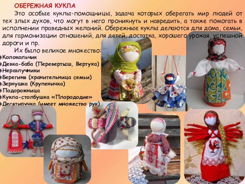 злых духов, что могут в него проникнуть и навредить, а также помогать в исполнении праведных желаний. Обережные куклы делаются для дома, семьи, для гармонизации отношений, для детей, достатка, хорошего урожая, успешной дороги и пр.