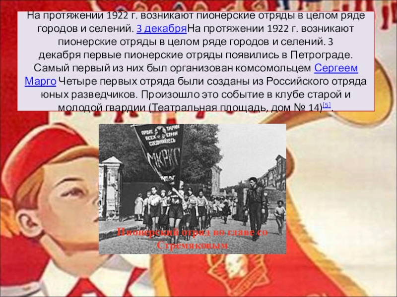 селений. 3 декабряНа протяжении 1922 г. возникают пионерские отряды в целом ряде городов и селений. 3 декабря первые пионерские отряды появились в Петрограде. Самый первый из них был организован комсомольцем Сергеем Марго Четыре первых отряда были созданы из Российского отряда юных разведчиков. Произошло это событие в клубе старой и молодой гвардии (Театральная площадь, дом № 14)[5].