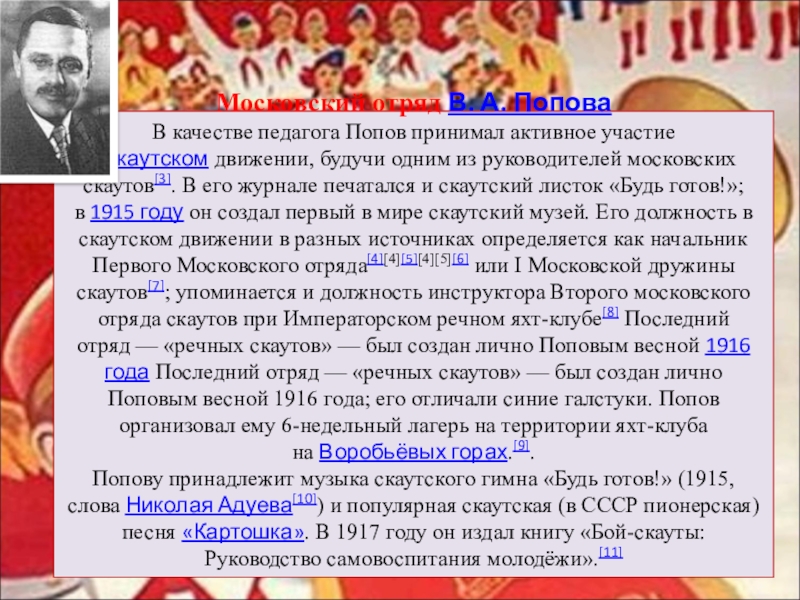из руководителей московских скаутов[3]. В его журнале печатался и скаутский листок «Будь готов!»; в 1915 году он создал первый в мире скаутский музей. Его должность в скаутском движении в разных источниках определяется как начальник Первого Московского отряда[4][4][5][4][5][6] или I Московской дружины скаутов[7]; упоминается и должность инструктора Второго московского отряда скаутов при Императорском речном яхт-клубе[8] Последний отряд — «речных скаутов» — был создан лично Поповым весной 1916 года Последний отряд — «речных скаутов» — был создан лично Поповым весной 1916 года; его отличали синие галстуки. Попов организовал ему 6-недельный лагерь на территории яхт-клуба на Воробьёвых горах.[9].