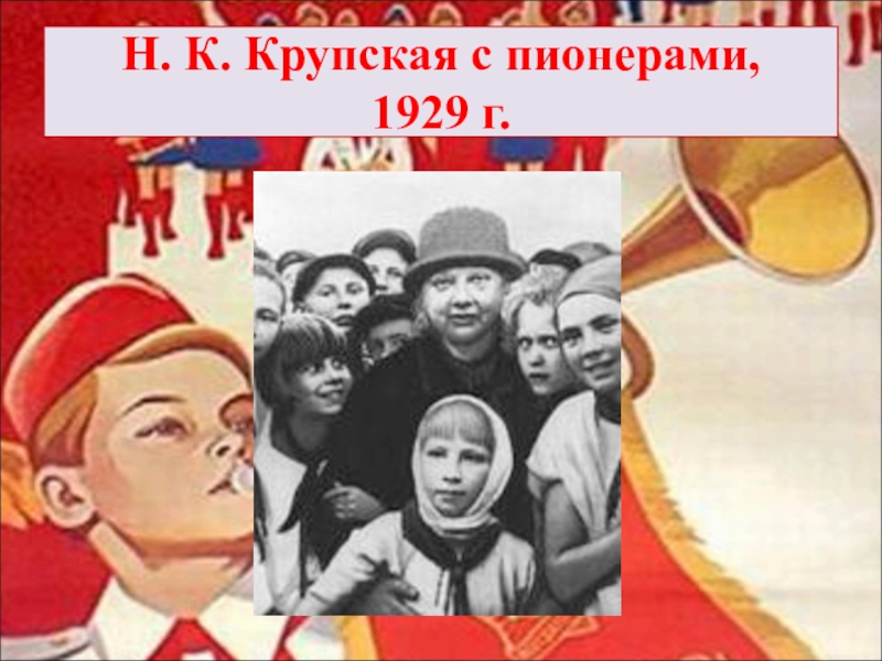 Слайд 6Н. К. Крупская с пионерами, 1929 г.