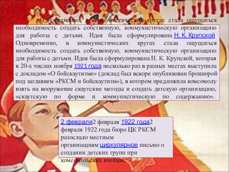 создать собственную, коммунистическую организацию для работы с детьми. Идея была сформулирована Н. К. Крупской Одновременно, в коммунистических кругах стала ощущаться необходимость создать собственную, коммунистическую организацию для работы с детьми. Идея была сформулирована Н. К. Крупской, которая в 20-х числах ноября 1921 года несколько раз в разных местах выступила с докладом «О бойскаутизме» (доклад был вскоре опубликован брошюрой под заглавием «РКСМ и бойскаутизм»), в котором предложила комсомолу взять на вооружение скаутские методы и создать детскую организацию, «скаутскую по форме и коммунистическую по содержанию».