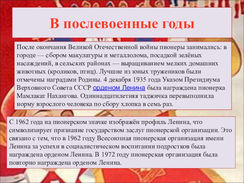 сбором макулатуры и металлолома, посадкой зелёных насаждений, в сельских районах — выращиванием мелких домашних животных (кроликов, птиц). Лучшие из юных тружеников были отмечены наградами Родины. 4 декабря 1935 года Указом Президиума Верховного Совета СССР орденом Ленина была награждена пионерка Мамлакат Нахангова. Одиннадцатилетняя таджичка перевыполнила норму взрослого человека по сбору хлопка в семь раз.