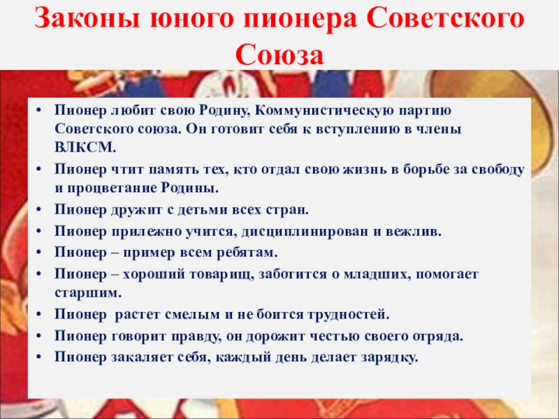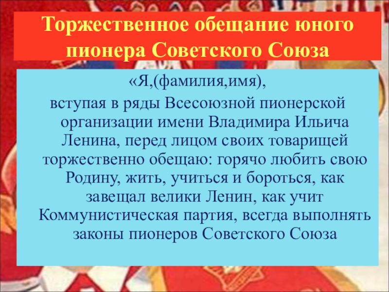 организации имени Владимира Ильича Ленина, перед лицом своих товарищей торжественно обещаю: горячо любить свою Родину, жить, учиться и бороться, как завещал велики Ленин, как учит Коммунистическая партия, всегда выполнять законы пионеров Советского Союза