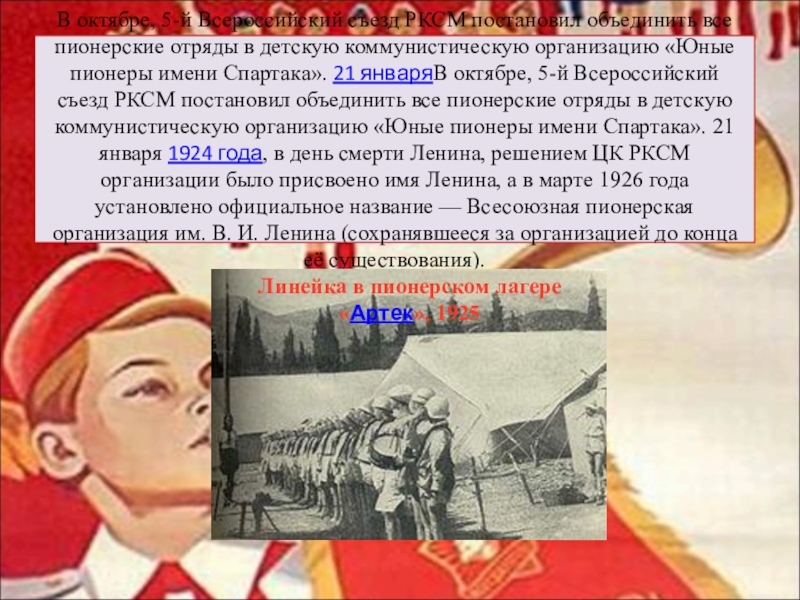 в детскую коммунистическую организацию «Юные пионеры имени Спартака». 21 январяВ октябре, 5-й Всероссийский съезд РКСМ постановил объединить все пионерские отряды в детскую коммунистическую организацию «Юные пионеры имени Спартака». 21 января 1924 года, в день смерти Ленина, решением ЦК РКСМ организации было присвоено имя Ленина, а в марте 1926 года установлено официальное название — Всесоюзная пионерская организация им. В. И. Ленина (сохранявшееся за организацией до конца её существования).