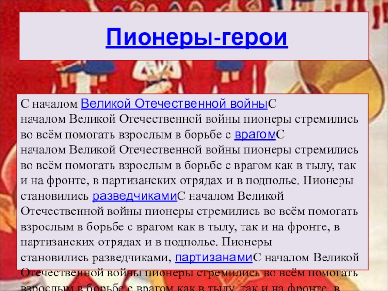 взрослым в борьбе с врагомС началом Великой Отечественной войны пионеры стремились во всём помогать взрослым в борьбе с врагом как в тылу, так и на фронте, в партизанских отрядах и в подполье. Пионеры становились разведчикамиС началом Великой Отечественной войны пионеры стремились во всём помогать взрослым в борьбе с врагом как в тылу, так и на фронте, в партизанских отрядах и в подполье. Пионеры становились разведчиками, партизанамиС началом Великой Отечественной войны пионеры стремились во всём помогать взрослым в борьбе с врагом как в тылу, так и на фронте, в партизанских отрядах и в подполье. Пионеры становились разведчиками, партизанами, юнгамиС началом Великой Отечественной войны пионеры стремились во всём помогать взрослым в борьбе с врагом как в тылу, так и на фронте, в партизанских отрядах и в подполье. Пионеры становились разведчиками, партизанами, юнгами на военных кораблях, помогали укрывать раненых. За боевые заслуги десятки тысяч пионеров награждены орденами и медалями, четверо посмертно удостоены звания Героя Советского Союза, четверо посмертно удостоены звания Героя Советского Союза — Лёня Голиков, четверо посмертно удостоены звания Героя Советского Союза — Лёня Голиков, Зина Портнова, четверо посмертно удостоены звания Героя Советского Союза — Лёня Голиков, Зина Портнова, Марат Казей, четверо посмертно удостоены звания Героя Советского Союза — Лёня Голиков, Зина Портнова, Марат Казей и Валя Котик[6]. Впоследствии погибшие пионеры были внесены в официальный список пионеров-героев.