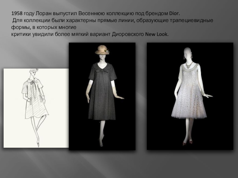 1958 году Лоран выпустил Весеннюю коллекцию под брендом Dior. Для коллекции были характерны прямые линии, образующие трапециевидные