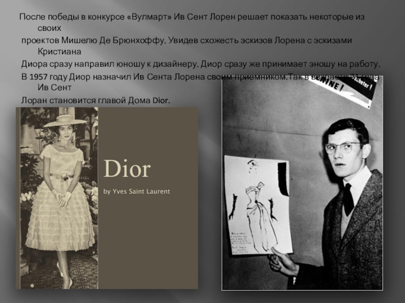 В 1957 году Диор назначил Ив Сента Лорена своим приемником.Так в возрасте 21 года Ив Сент