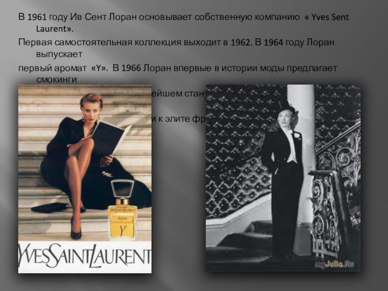 Слайд 6В 1961 году Ив Сент Лоран основывает собственную компанию « Yves