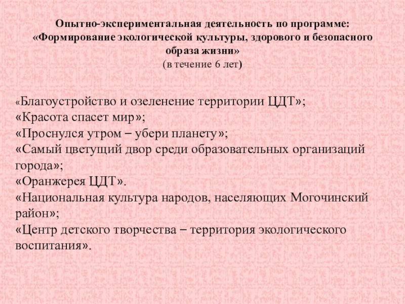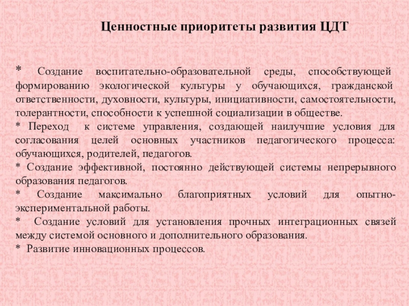 Центр детского творчества осуществляет образовательный процесс по 5 направленностям: художественно-эстетической; физкультурно- спортивной; социально – педагогической; эколого – биологической; научно – технической.