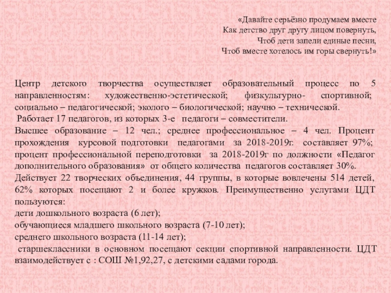Действует 22 творческих объединения, 44 группы, в которые вовлечены 514 детей, 62% которых посещают 2 и более кружков. Преимущественно услугами ЦДТ пользуются: