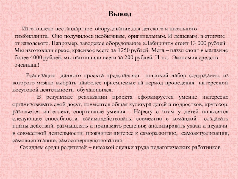 Изготовлено нестандартное оборудование для детского и школьного тимбилдинга. Оно получилось необычным, оригинальным. И дешевым, в отличие от заводского. Например, заводское оборудование «Лабиринт» стоит 13 000 рублей. Мы изготовили яркое, красивое всего за 1250 рублей. Мега – паззл стоит в магазине более 4000 рублей, мы изготовили всего за 200 рублей. И т.д. Экономия средств очевидна!