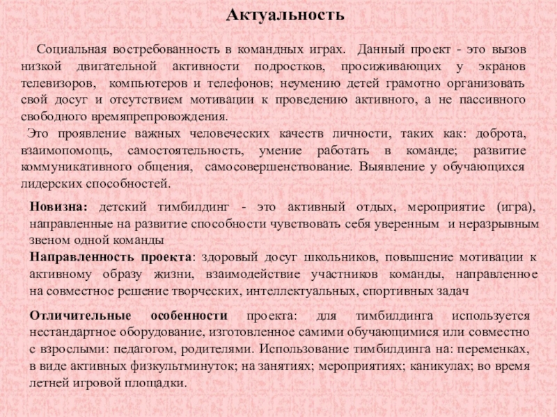 Социальная востребованность в командных играх. Данный проект - это вызов низкой двигательной активности подростков, просиживающих у экранов телевизоров, компьютеров и телефонов; неумению детей грамотно организовать свой досуг и отсутствием мотивации к проведению активного, а не пассивного свободного времяпрепровождения.