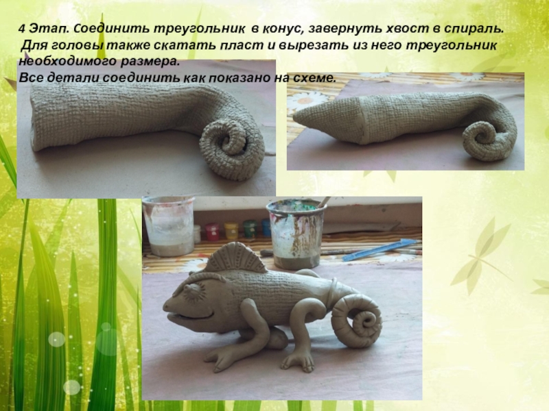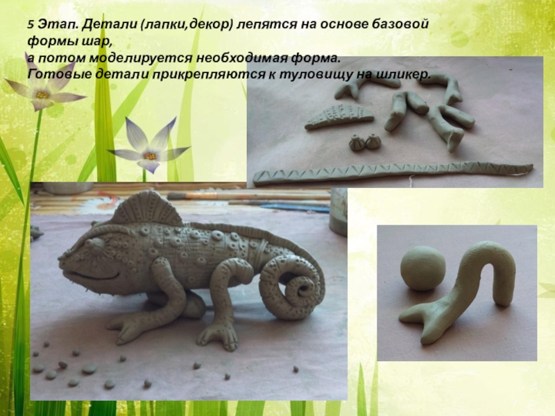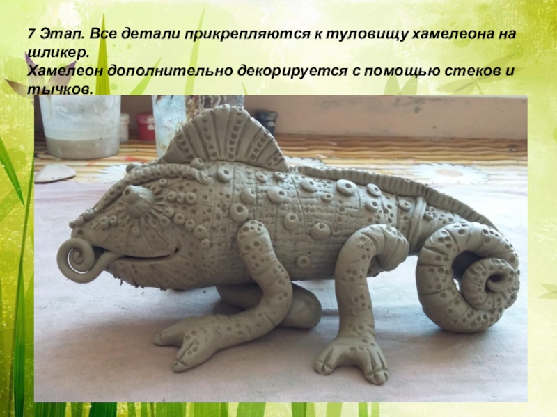 Слайд 167 Этап. Все детали прикрепляются к туловищу хамелеона на шликер.