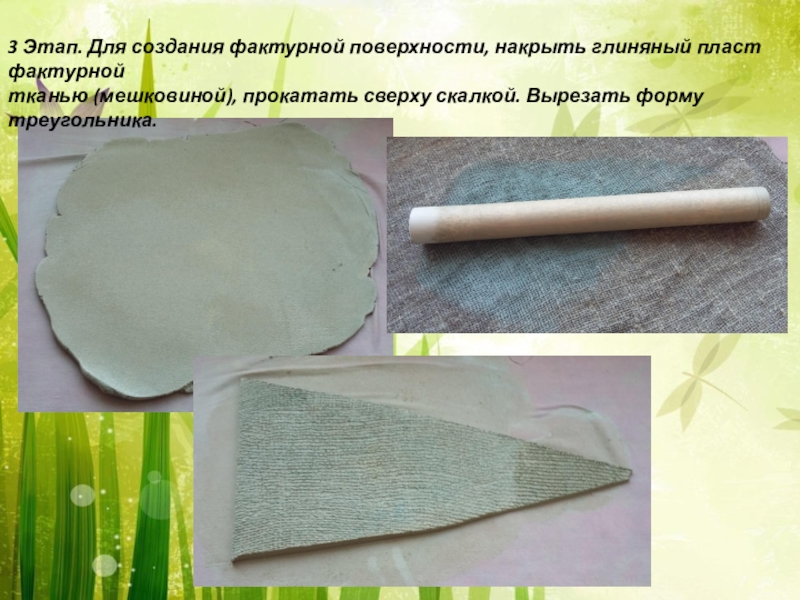 Слайд 123 Этап. Для создания фактурной поверхности, накрыть глиняный пласт фактурной