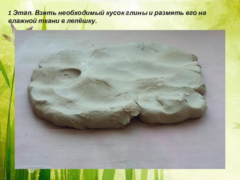 Слайд 101 Этап. Взять необходимый кусок глины и размять его на влажной