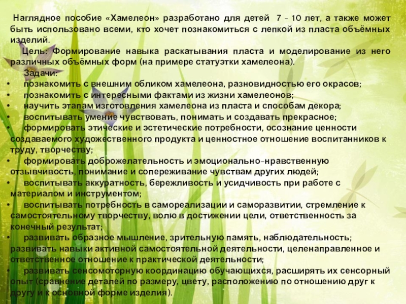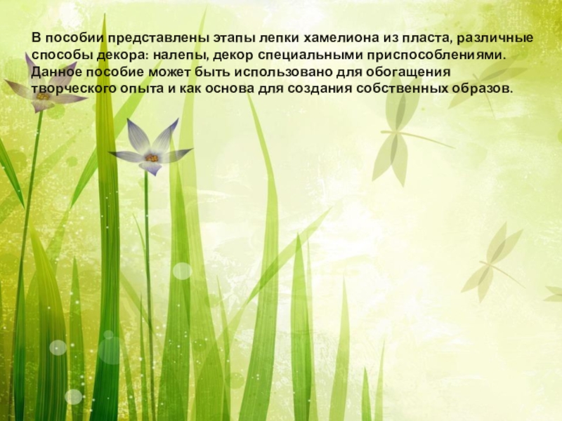 Слайд 3В пособии представлены этапы лепки хамелиона из пласта, различные способы декора: