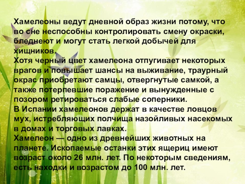 Слайд 5Хамелеоны ведут дневной образ жизни потому, что во сне неспособны контролировать