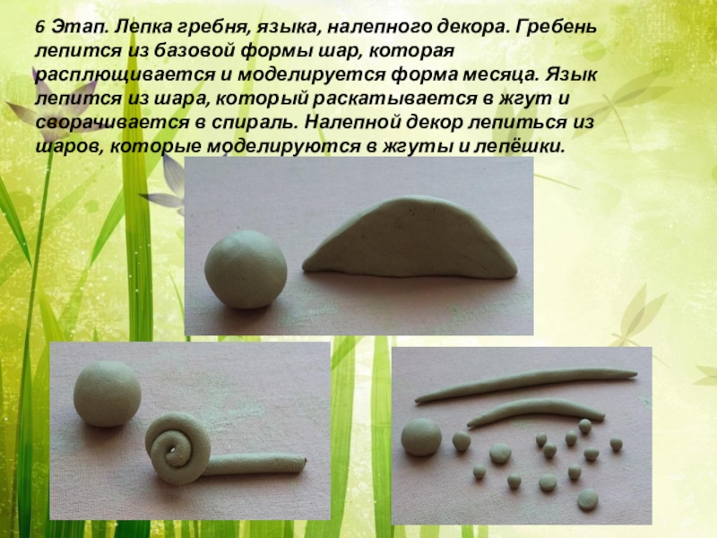 Слайд 156 Этап. Лепка гребня, языка, налепного декора. Гребень лепится из базовой