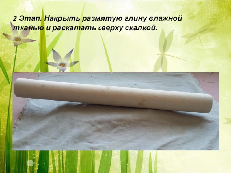 Слайд 112 Этап. Накрыть размятую глину влажной тканью и раскатать cверху скалкой.
