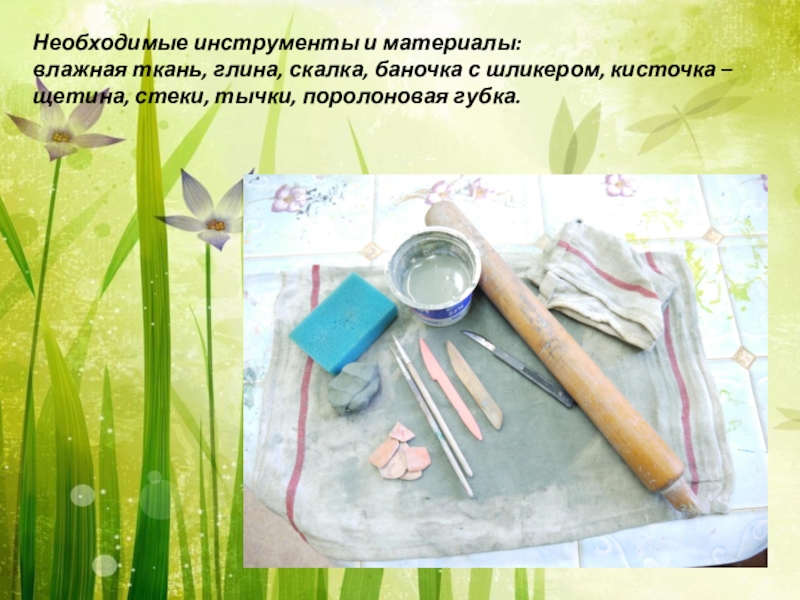 влажная ткань, глина, скалка, баночка с шликером, кисточка