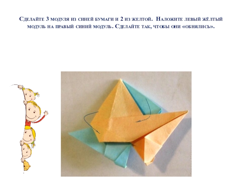 Слайд 4Сделайте 3 модуля из синей бумаги и 2 из желтой. Наложите