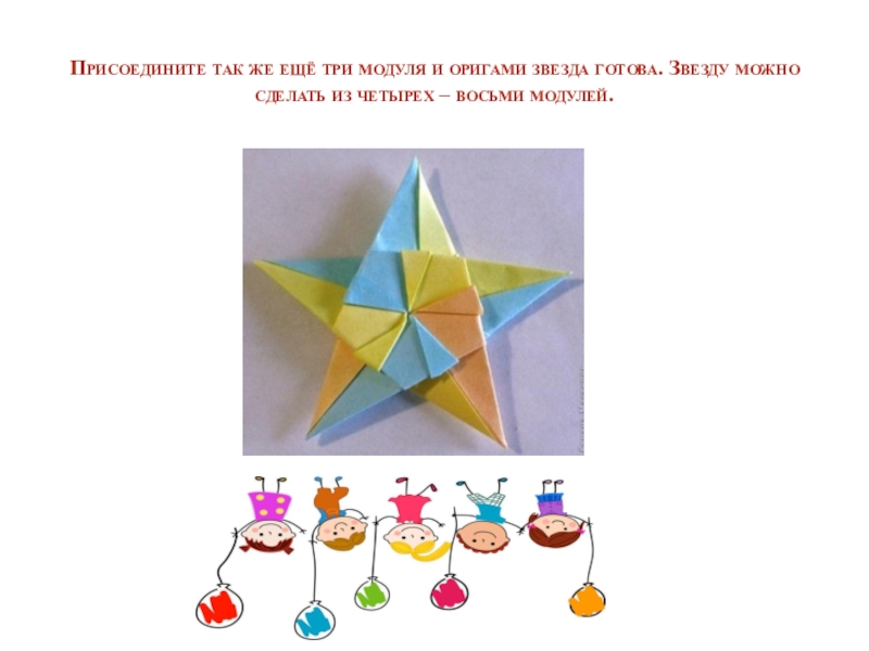Слайд 5Присоедините так же ещё три модуля и оригами звезда готова. Звезду