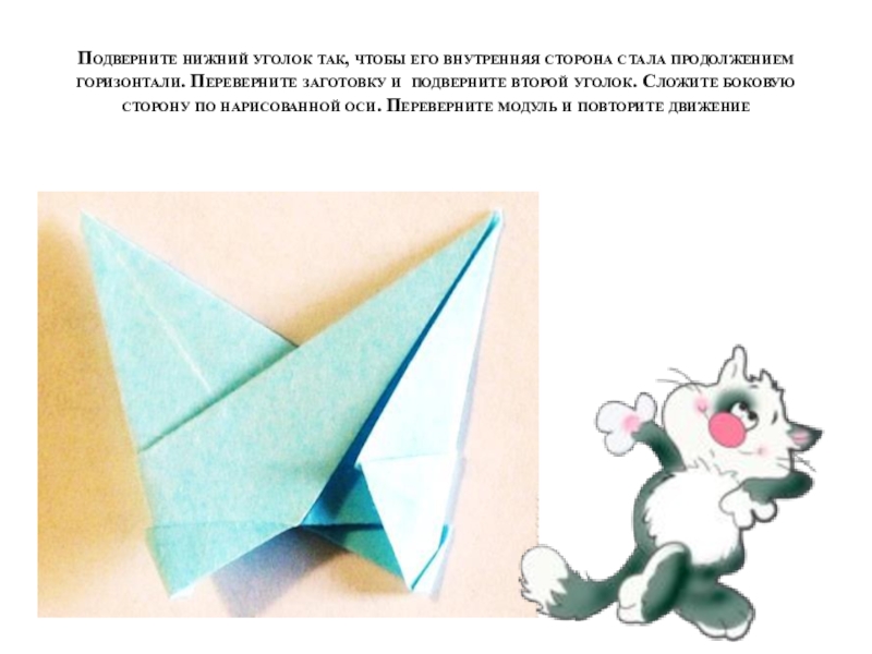 Слайд 3Подверните нижний уголок так, чтобы его внутренняя сторона стала продолжением горизонтали.