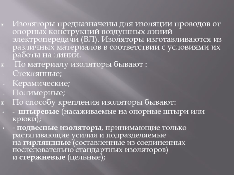 Поддерживающие и натяжные гир-лянды изоляторов закрепляются на траверсе промежуточной опоры при помощи серьги (1). Серьга с одной стороны соединяется со скобой или с деталью на траверсе, а с другой стороны вставляется в шапку верх-него изолятора (2). К нижнему изоля-тору гирлянды за ушко (3) прикреплён поддерживающий зажим (4), в который помещён провод (5).