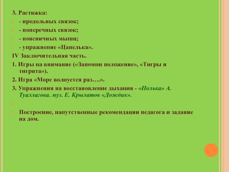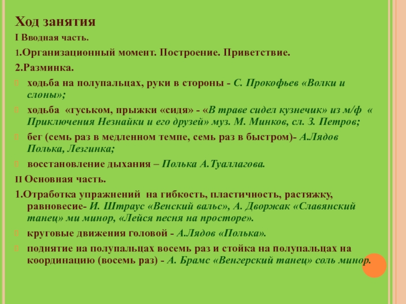 1.Отработка упражнений на гибкость, пластичность, растяжку, равновесие- И. Штраус «Венский вальс», А. Дворжак «Славянский танец» ми минор, «Лейся песня на просторе».