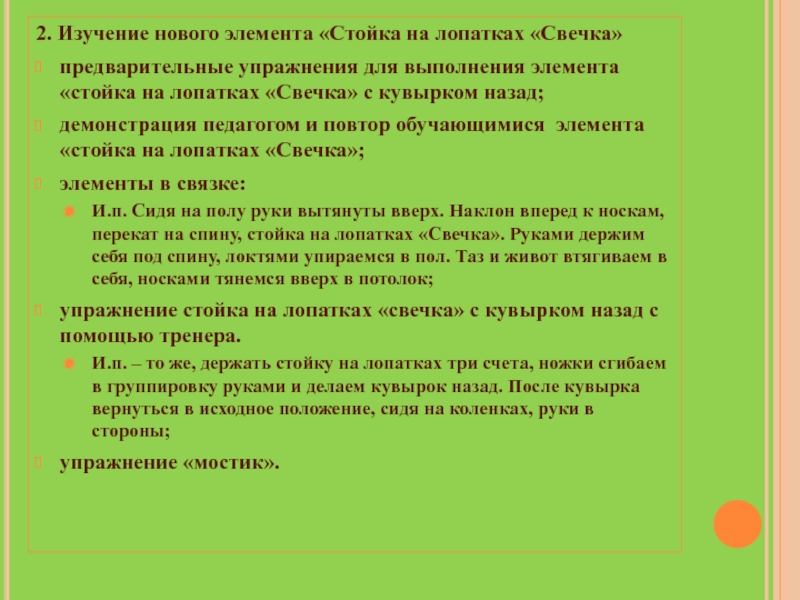 ИЗУЧЕНИЕ ЭЛЕМЕНТА СТОЙКА НА ЛОПАТКАХ «СВЕЧКА» С КУВЫРКОМ НАЗАД