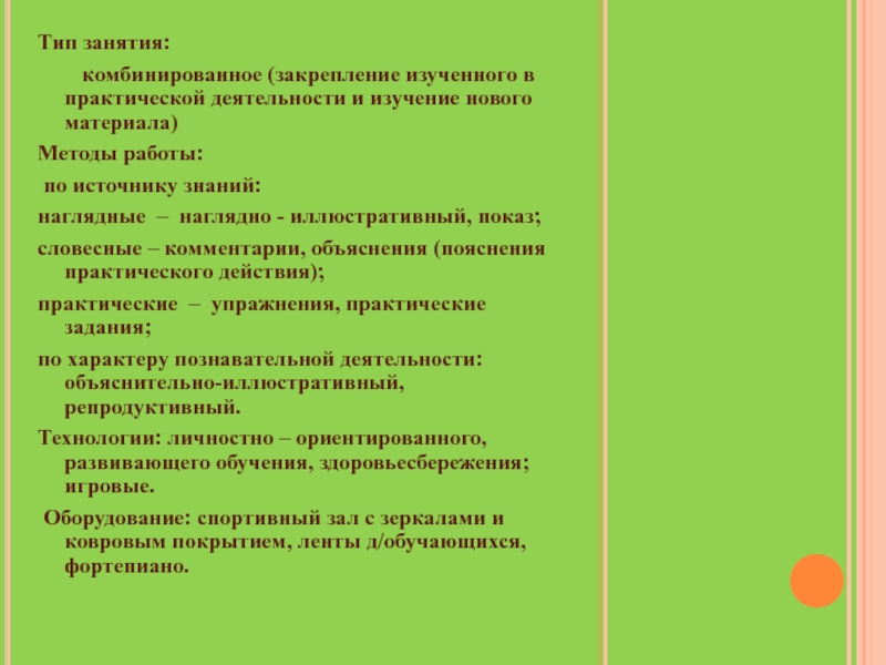 Оборудование: спортивный зал с зеркалами и ковровым покрытием, ленты д/обучающихся, фортепиано.