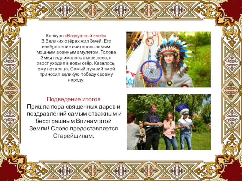 Старейшины, обещаем судить честно и справедливо. У индейцев такой обычай- за каждый подвиг воин мог в свой головной убор поместить одно перо. Чем пышнее головной убор, тем больше побед и заслуг. Ваша задача- как можно больше заслужить перьев для своего племени. И пусть пошлют вам небеса- достойной победы, о наши славные воины! Желаем с честью пройти все испытания, не потеряв ни одного скальпа.