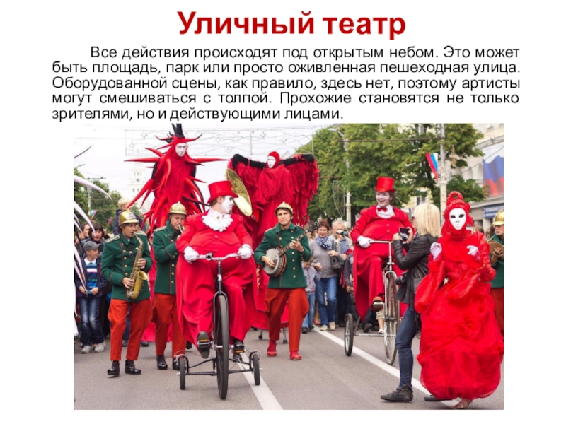 небом. Это может быть площадь, парк или просто оживленная пешеходная улица. Оборудованной сцены, как правило, здесь нет, поэтому артисты могут смешиваться с толпой. Прохожие становятся не только зрителями, но и действующими лицами.