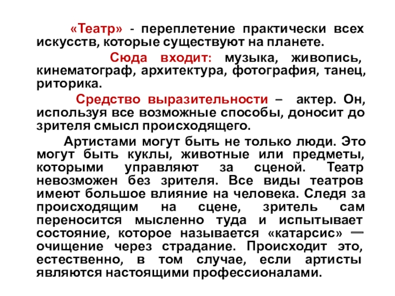 Слайд 2 «Театр» - переплетение практически всех искусств, которые существуют