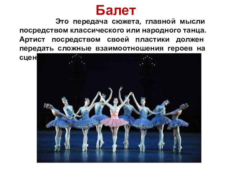 мысли посредством классического или народного танца. Артист посредством своей пластики должен передать сложные взаимоотношения героев на сцене.