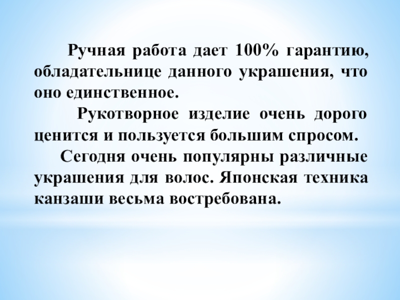 Слайд 11 Ручная работа дает 100% гарантию, обладательнице данного украшения,