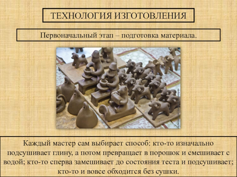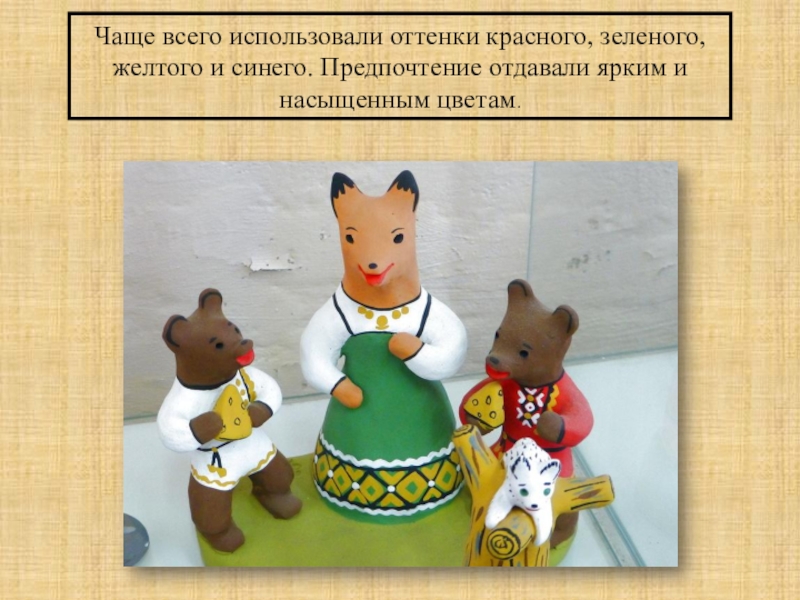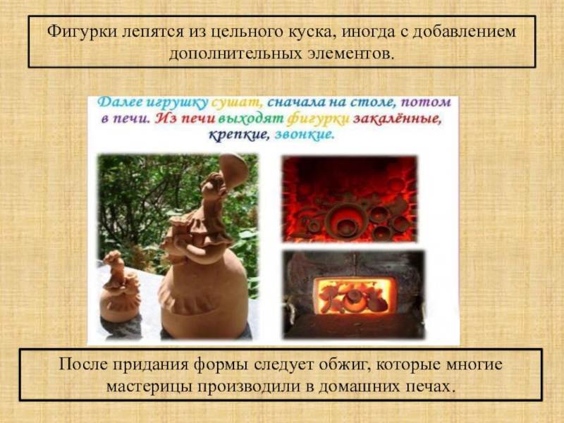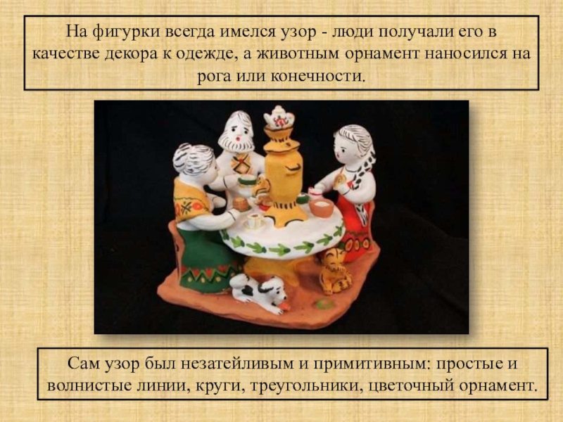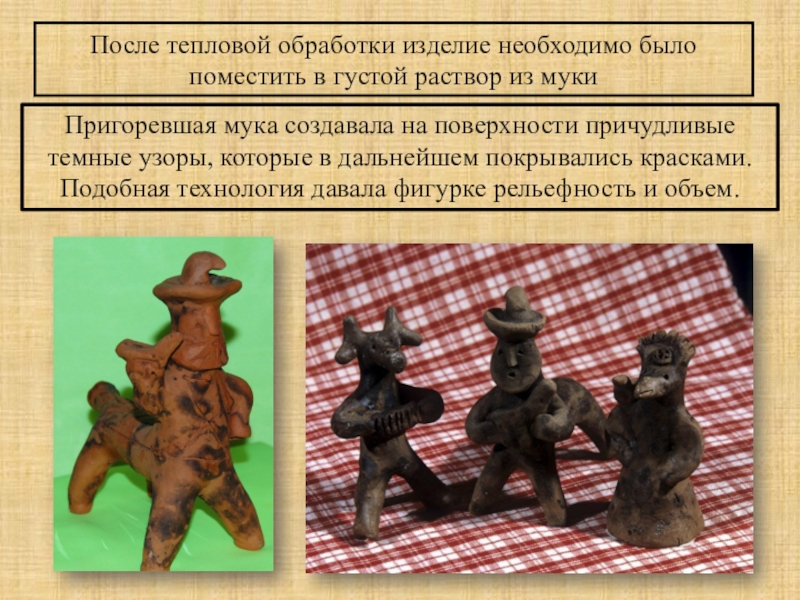 Пригоревшая мука создавала на поверхности причудливые темные узоры, которые в дальнейшем покрывались красками. Подобная технология давала фигурке рельефность и объем.
