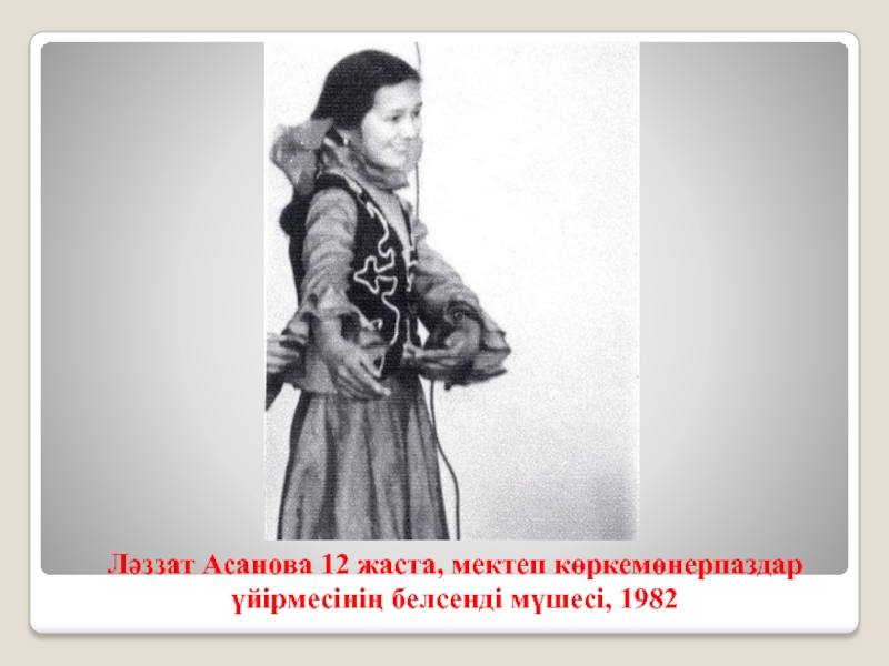 Слайд 37Ләззат Асанова 12 жаста, мектеп көркемөнерпаздар үйірмесінің белсенді мүшесі, 1982