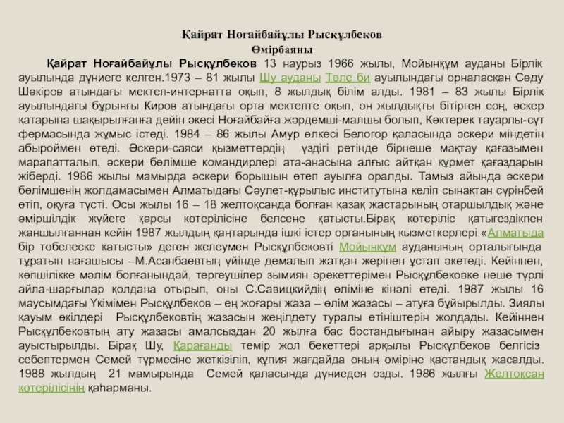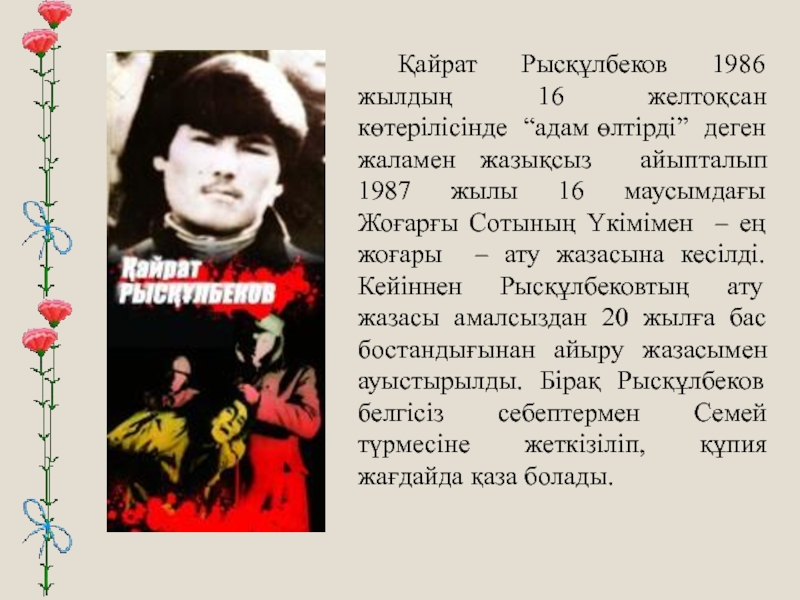 Слайд 14 Қайрат Рысқұлбеков 1986 жылдың 16 желтоқсан көтерілісінде “адам өлтірді” деген жаламен