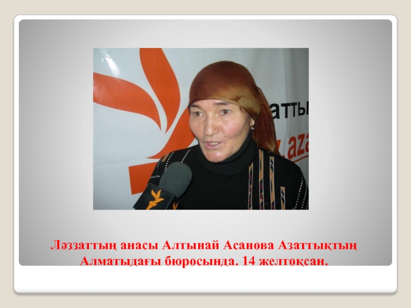 Слайд 34Ләззаттың анасы Алтынай Асанова Азаттықтың Алматыдағы бюросында. 14 желтоқсан.