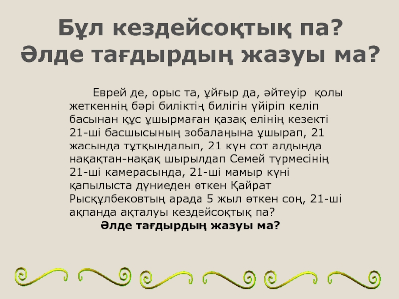 та, ұйғыр да, әйтеуір қолы жеткеннің бәрі биліктің билігін үйіріп келіп басынан құс ұшырмаған қазақ елінің кезекті 21-ші басшысының зобалаңына ұшырап, 21 жасында тұтқындалып, 21 күн сот алдында нақақтан-нақақ шырылдап Семей түрмесінің 21-ші камерасында, 21-ші мамыр күні қапылыста дүниеден өткен Қайрат Рысқұлбековтың арада 5 жыл өткен соң, 21-ші ақпанда ақталуы кездейсоқтық па?