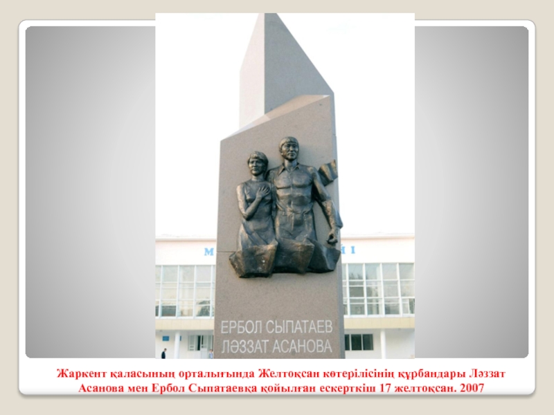 Слайд 40Жаркент қаласының орталығында Желтоқсан көтерілісінің құрбандары Ләззат Асанова мен Ербол Сыпатаевқа
