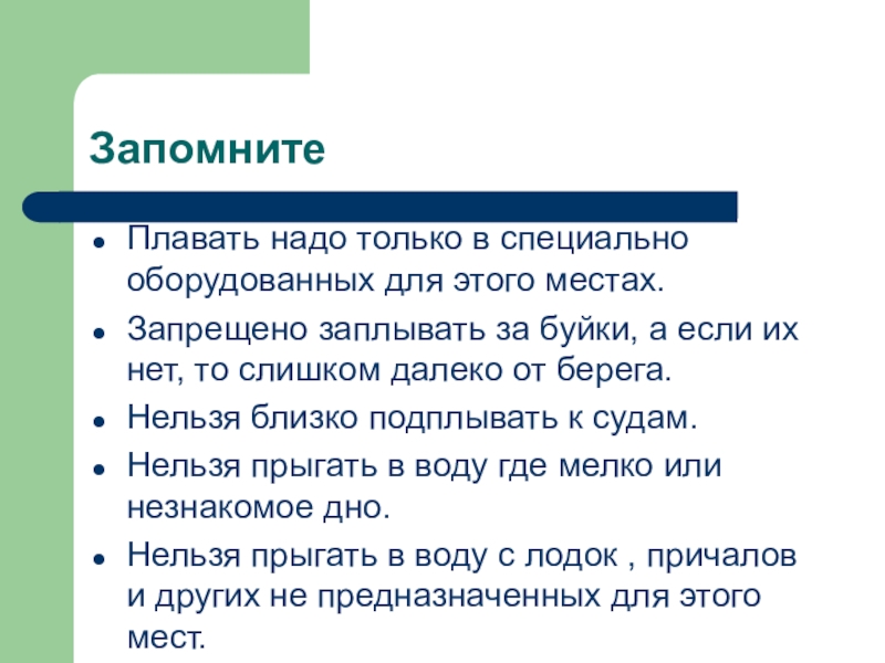 ЗапомнитеПлавать надо только в специально оборудованных для этого местах.Запрещено заплывать за буйки, а если их нет, то