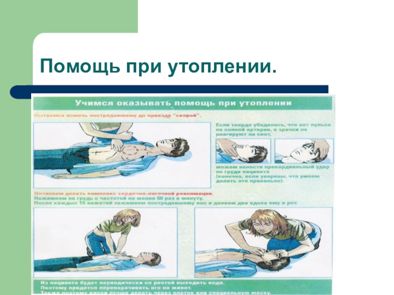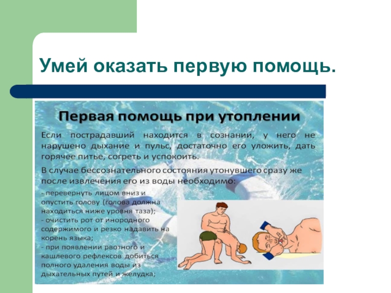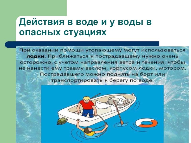 Слайд 14Действия в воде и у воды в опасных стуациях