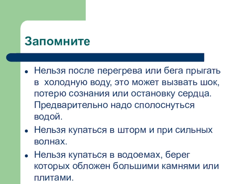 ЗапомнитеНельзя после перегрева или бега прыгать в холодную воду, это может вызвать шок, потерю сознания или остановку