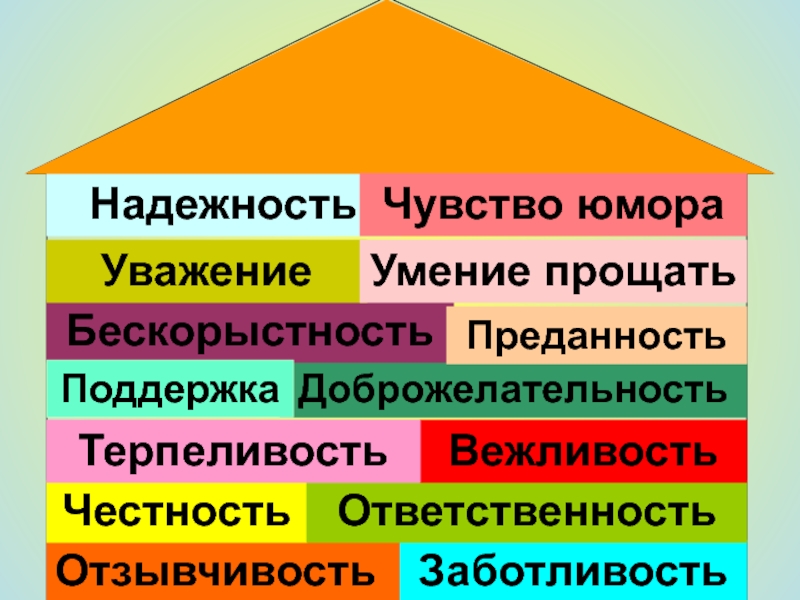 Отзывчивость ЗаботливостьЧестность Ответственность Вежливость Доброжелательность Терпеливость Бескорыстность ПоддержкаПреданность Уважение НадежностьУмение прощатьЧувство юмора