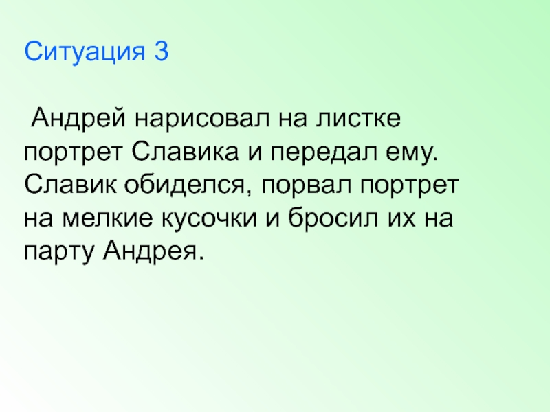 Ситуация 3 Андрей нарисовал на листке портрет Славика и передал ему. Славик обиделся, порвал портрет на мелкие
