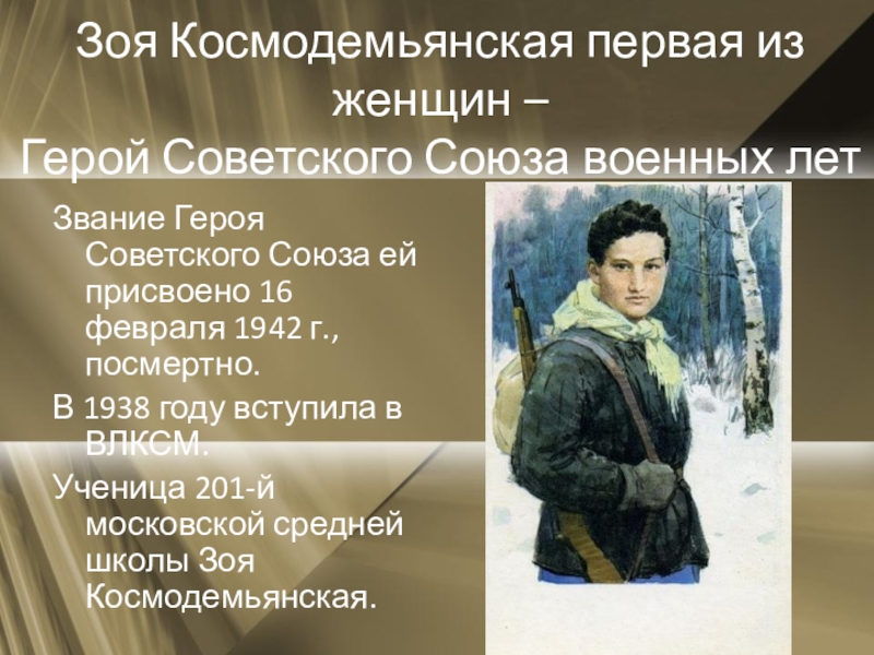 Ученица 201-й московской средней школы Зоя Космодемьянская.