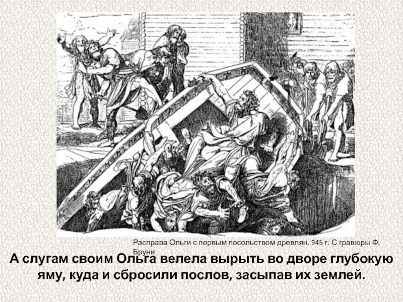 А слугам своим Ольга велела вырыть во дворе глубокую яму, куда и сбросили послов, засыпав их землей.