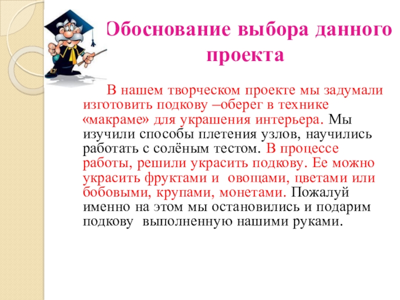 изготовить подкову –оберег в технике «макраме» для украшения интерьера. Мы изучили способы плетения узлов, научились работать с солёным тестом. В процессе работы, решили украсить подкову. Ее можно украсить фруктами и овощами, цветами или бобовыми, крупами, монетами. Пожалуй именно на этом мы остановились и подарим подкову выполненную нашими руками.